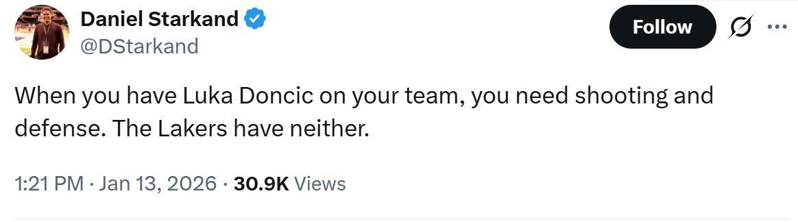赛后湖人队记Daniel Starkand一针见血的指出:“当你阵容中有东契奇这样的球员时,你需要的就是投射能力和防守,而当下的湖人两者都不具备。”